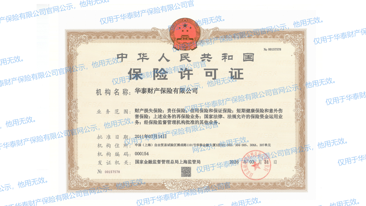 华泰财产保险有限公司保险许可证